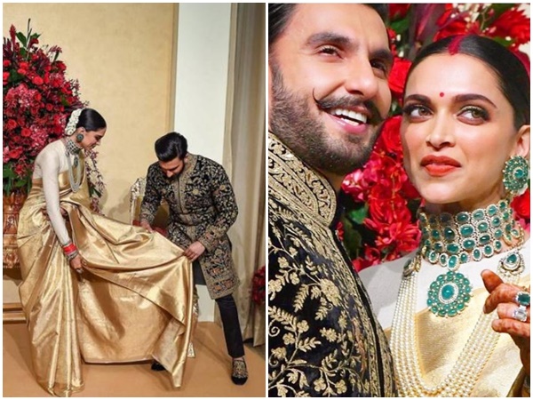 ദീപിക അമ്മ സമ്മാനിച്ച ഗോള്ഡന് കളറിലുള്ള കാഞ്ചീപുരം സാരിയായിരുന്നു ഉടുത്തത്. പഴിവും കൊണ്ടുള്ള അലുക്കുകള് കോര്ത്ത മരതകം പതിപ്പിച്ച വലിയ ചോക്കറും അണിഞ്ഞിരുന്നു. രോഹിത് ബാല് ഡിസൈന് ചെയ്ത ഗോള്ഡും കറുപ്പും ഇടകലര്ന്ന ഷര്വാണിയാണ് രണ്വീര് റിസ്പഷനായി തിരഞ്ഞെടുത്തിരുന്നത്. ഈ ചിത്രങ്ങളും താരങ്ങള് തന്നെയായിരുന്നു പുറത്ത് വിട്ടത്. പ്രമുഖരായ ഒട്ടനവധി പേര് വിരുന്ന് സത്കാരത്തില് പങ്കെടുക്കാന് എത്തിയിരുന്നു.