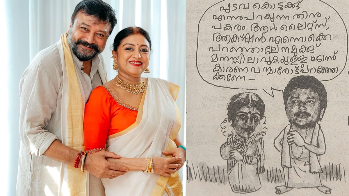 'ഒരു അപരന് ഉണ്ടായിരുന്നേല് ഇവിടെ നിര്ത്തിയിട്ട് ആരാധകരില് നിന്ന് രക്ഷപ്പെട്ട് കല്യാണം മണ്ഡപത്തില് എത്താമായിരുന്നു എന്ന് ജയറാം പറയുന്ന രീതിയിലാണ് കാര്ട്ടൂണിന് തുടക്കം. പിന്നാലെ പാര്വതിയുടെ മറുപടിയുമുണ്ട്. മുണ്ടില് മുറുക്കിപ്പിടിച്ചോളണേ, പെരുമ്പാവൂരില് തുണി കടയിലെ ഉദ്ഘാടനത്തിന് പറ്റിയത് പോലെ ആരാധകര് മുണ്ടങ്ങ് കൊണ്ടുപോയാല് നാണക്കേട് ആവുമെന്ന്', പാര്വതി പറയുന്നു.