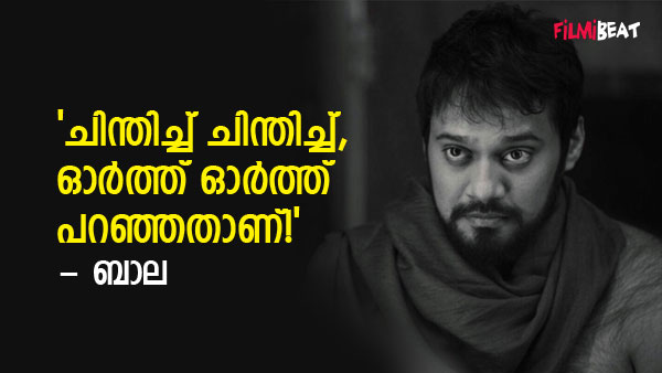 'ഞാൻ ഇപ്പോൾ ചെന്നൈയിൽ വന്നത് കുറച്ച് നല്ല കാര്യങ്ങൾ ചെയ്യാനാണ്. ചില കമ്മിറ്റ്മെന്റുകളാണ് എന്റെ സ്നേഹമാണ്. ഞാൻ ആർക്കും അഭിമുഖം നൽകാൻ തയ്യാറാണ്. പക്ഷെ നേരിട്ട് ചോദിക്കണം. പുറകിൽ നിന്ന് ചോദിക്കണ്ട. അങ്ങനെയാണെങ്കിൽ ഉത്തരം നല്കാൻ ഞാൻ തയ്യാറാണ്. നമ്മുക്ക് സ്നേഹത്തോടെ മുന്നോട്ട് പോകാം,' ബാല പറഞ്ഞു.