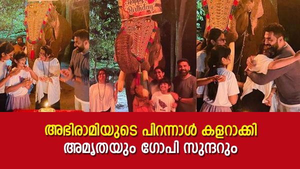ആനയും ചെണ്ടമേളവുമൊക്കെയായി പിറന്നാൾ ആഘോഷം കളറാക്കുകയായിരുന്നു താരങ്ങൾ. ഗോപി സുന്ദറാണ് പിറന്നാൾ ആഘോഷത്തിന്റെ ചിത്രങ്ങൾ സോഷ്യൽ മീഡിയയിൽ പങ്കുവച്ചത്. 'ഹാപ്പി ബർത്ത്ഡേ മൈ ഡിയർ മൂത്തമോളെ' എന്ന അടിക്കുറിപ്പോടെയാണ് ഗോപി ചിത്രങ്ങൾ പങ്കുവച്ചത്. അമൃതയെയും അഭിരാമിയെയും ഗോപിയെയും കൂടാതെ അമൃതയുടെ മകൾ പപ്പുവും ഇവർക്കൊപ്പം ചിത്രങ്ങളിലുണ്ട്. രാത്രിയിൽ ആയിരുന്നു ആഘോഷം. അഭിരാമിക്ക് സർപ്രൈസയാണ് അമൃതയും ഗോപിയും ഇത്തരമൊരു ആഘോഷം സംഘടിപ്പിച്ചത് എന്നാണ് ചിത്രങ്ങളിൽ നിന്ന് വ്യക്തമാവുന്നത്.