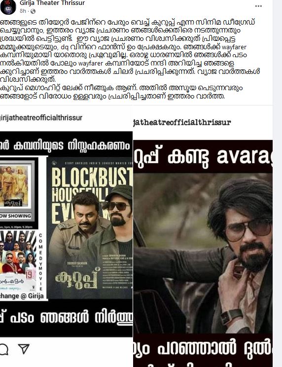 "ഞങ്ങളുടെ തിയേറ്റർ പേജിന്റെ പേരും വെച്ച് കുറുപ്പ് എന്ന സിനിമ ഡീഗ്രേഡ് ചെയ്യുവാനും, ഇത്തരം വ്യാജ പ്രചരണം ഞങ്ങൾക്കെതിരെ നടത്തുന്നതും ശ്രദ്ധയിൽ പെട്ടിട്ടുണ്ട്. ഈ വ്യാജ പ്രചരണം വിശ്വസിക്കരുത്, പ്രിയപ്പെട്ട മമ്മൂക്കയുടെയും, dq വിന്റെ ഫാൻസും പ്രേക്ഷകരും. ഞങ്ങൾക്ക് wayfarer കമ്പനിയുമായി യാതൊരു പ്രശ്നവുമില്ല. ഒരാഴ്ച ധാരണയിൽ ഞങ്ങൾക്ക് പടം നൽകിയതിൽ പോലും wayfarer കമ്പനിയോട് നന്ദി അറിയിച്ച ഞങ്ങളെ ക്കുറിച്ചാണ് ഇത്തരം വാർത്തകൾ ചിലർ പ്രചരിപ്പിക്കുന്നത്. വ്യാജ വാർത്തകൾ വിശ്വസിക്കരുത്. കുറുപ്പ് മെഗാഹിറ്റ് ലേക്ക് നീങ്ങുക ആണ്. അതിൽ അസൂയ പെടുന്നവരും ഞങ്ങളോട് വിരോധം ഉള്ളവരും പ്രചരിപ്പിച്ചതാണ് ഇത്തരം വാർത്ത," തിയേറ്റർ ഫേസ്ബുക്ക് പോസ്റ്റിൽ പറയുന്നു.
