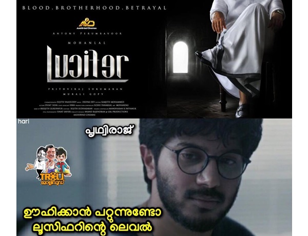 ശരിക്കുമുള്ള ലൂസിഫറിന്റെ പോസ്റ്റര് മോഹന്ലാലിന്റെ മുഖമുള്ളതായിരുന്നു. എന്നാല് ഫേസ്ബുക്കിലിട്ടപ്പോള് മുഖം അറിയാതെ ക്രോപ്പ് ആയി പോവുന്നു. ശേഷം വന്ന പോസ്റ്റര് അടാര് ലുക്ക് ആയതാണ്.