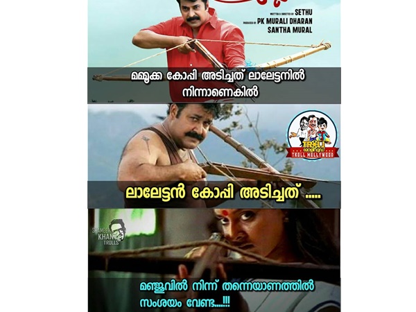 മമ്മൂട്ടി മോഹന്ലാലില് നിന്ന് കോപ്പിയടിച്ചെങ്കില് മോഹന്ലാല് അത് കോപ്പിയടിച്ചത് മഞ്ജു വാര്യരില് നിന്നാണെന്നാണ് സോഷ്യല് മീഡിയയുടെ കണ്ടെത്തല്. കണ്ണെഴുതി പൊട്ടും തൊട്ടിലെ ഭദ്രയില് നിന്നാവുമോ അത്?