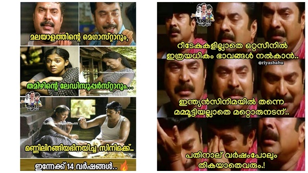 ചിത്രത്തില് റീടേക്കുകളില്ലാതെ ഒറ്റ സീനില് വിവിധ ഭാവങ്ങള് കാണിക്കുന്ന മമ്മൂട്ടിയുടെ രംഗമുണ്ട്. മമ്മൂട്ടി കരയുന്നതിനൊപ്പം പ്രേക്ഷകരെയും ഒരുപോലെ കരയിപ്പിക്കുന്ന രംഗമാണിത്. ഇന്ത്യന് സിനിമയില് മമ്മൂട്ടിയല്ലാതെ മറ്റൊരു നടന് ഇത് ചെയ്യാന് പതിനാല് വര്ഷം പോലും തികയാതെ വരുമെന്നാണ് ട്രോളന്മാര് പറയുന്നത്.