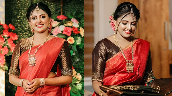 ചുവപ്പുനിറത്തിലുള്ള പട്ടുസാരിയില് അണിഞ്ഞൊരുങ്ങി നില്ക്കുന്ന ചിത്രങ്ങളാണ് ശ്രീവിദ്യ പങ്കുവെച്ചിരിക്കുന്നത്. നെറ്റിച്ചുട്ടിയും സാരിയ്ക്ക് ചേരുന്ന ആഭരണങ്ങളുമാണ് ശ്രീവിദ്യ ധരിച്ചിരിക്കുന്നത്. മിനിമല് മേക്കപ്പാണ് താരം തിരഞ്ഞെടുത്തിരിക്കുന്നത്.