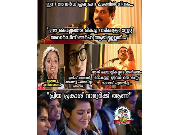 ഈ കൊല്ലത്തെ മികച്ച നടിയായി തങ്ങള് തിരഞ്ഞെക്കുപ്പെടുമെന്ന് കരുതിയിരിക്കുന്ന പാര്വ്വതിയും മഞ്ജു വാര്യരും. എന്നാല് അത് പ്രിയ പ്രകാശ് വാര്യര്ക്കുള്ളതാണെന്ന് അനൗണ്സ് ചെയ്താല് എങ്ങനെയുണ്ടാവും.