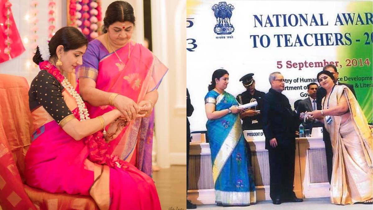 മികച്ച അധ്യാപികയ്ക്കുള്ള ദേശീയ പുരസ്കാരം സ്വീകരിക്കുന്ന അമ്മയുടെ ചിത്രങ്ങളും ദിവ്യ ഉണ്ണി പോസ്റ്റ് ചെയ്തിട്ടുണ്ട്. കുട്ടിക്കാലം മുതലേ തന്നെ നൃത്തത്തിന്റെ വഴിയിലേക്ക് കൈപിടിച്ച് നയിച്ചത് അമ്മയാണെന്ന് നേരത്തെ ദിവ്യ ഉണ്ണി പറഞ്ഞിരുന്നു. സിനിമയില് അഭിനയിച്ചിരുന്ന സമയത്തും പഠനം ഉഴപ്പുന്നില്ലെന്ന് അമ്മ ഉറപ്പ് വരുത്തിയിരുന്നു. അമ്മയുടെയും അച്ഛന്റേയും പിന്തുണയെക്കുറിച്ച് വാചാലയായി താരം നേരത്തെ എത്തിയിരുന്നു.