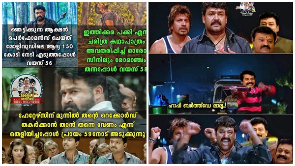 രണ്ട് ദിവസം മുന്പ് തന്നെ മോഹന്ലാലിന്റെ പിറന്നാള് ദിനത്തിന് വേണ്ടിയുള്ള മുന്നൊരുക്കങ്ങളിലായിരുന്നു ആരാധകര്. പ്രിയതാരത്തിന് ട്രീബ്യൂട്ട് ഒരുക്കിയും ഹിറ്റ് സിനിമകളിലെ രംഗങ്ങള് കോര്ത്തിണക്കി വീഡിയോസ് പുറത്തിറക്കിയും മോഹന്ലാലിനോടുള്ള സ്നേഹം ഓരോരുത്തരും പ്രകടിപ്പിച്ച് കൊണ്ടിരിക്കുകയാണ്. സോഷ്യല് മീഡിയ നിറയെ ജന്മദിന ആശംസകളുടെ ഘോഷയാത്രയാണ്. ഇവര്ക്കൊപ്പം ട്രോളന്മാരും എത്തിയിരിക്കുകയാണ്. മോഹന്ലാലിനെ കുറിച്ചുള്ള എല്ലാ കാര്യങ്ങളും ട്രോളുകളുടെ രൂപത്തില് എത്തിയിരിക്കുകയാണ്.