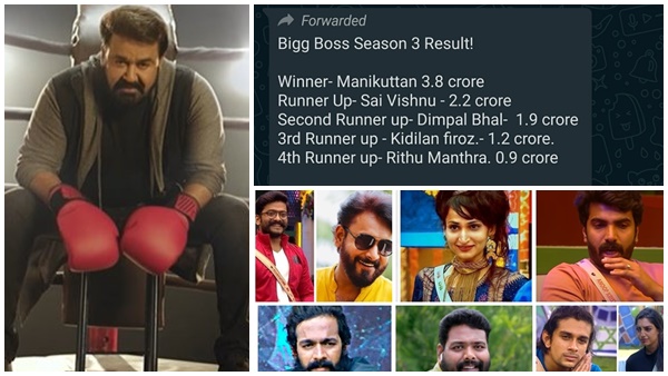 ഇപ്പോൾ സോഷ്യൽ മീഡിയയിൽ വൈറലാകുന്നത്. സീസൺ 3 ലെ വിജയികളുടെ പേരും അവർക്ക് ലഭിക്കുന്ന പ്രതഫലത്തെ കുറിച്ചുമുള്ള റിപ്പോർട്ടാണ്. ബിഗ് ബോസ് മലയാളം സീസൺ 3 ബിബിഎംഎസ് 3 എന്ന ഫേസ്ബുക്ക് പേജിലൂടെയാണ് ഇക്കാര്യം പുറത്തു വന്നിരിക്കുന്നത്. ഒരു വാട്സ് ആപ്പ് സന്ദേശത്തിന്റെ സ്ക്രീൻ ഷോർട്ടാണ് പ്രത്യക്ഷപ്പെട്ടിരിക്കുന്നത്. ബിഗ് ബോസ് സീസൺ3 ഫലം വിജയ്; മണിക്കുട്ടൻ , പ്രതിഫലം 3.8 കോടി, റണ്ണറപ്പ് ; സായ് വിഷ്ണു,, 2.2കോടി, സെക്കൻഡ് റണ്ണറപ്പ് ; ഡിംപൽ, 1.9 കോടി. മൂന്നാം സ്ഥാനം കിടിലൻ ഫിറോസ്; 1.2 കോടി, നാല്; ഋതു മന്ത്ര- 0.9 കോടി. എന്നിങ്ങനെയാണ് പ്രചരിക്കുന്ന സന്ദേശത്തിൽ പറയുന്നത്. 11.4 കോടി വോട്ടുകൾ ലഭിച്ചിട്ടുണ്ടെന്നും ഇതിൽ പറയുന്നുണ്ട്. ഫിനാലെയുടെ ഉടനെ അറിയിക്കുമെന്നും പറയുന്നുണ്ട്. എത്രത്തോളം വിശ്വസിക്കാം എന്ന അടിക്കുറിപ്പോടൊയാണ് വാട്സാപ്പ് സന്ദേശത്തിന്റെ സ്ക്രീൻ ഷോർട്ട് പ്രചരിക്കുന്നത്. എന്നാൽ ഇത് സത്യമല്ലെന്നാണ് പ്രേക്ഷകരിൽ അധികം പേരും പറയുന്നത്.
