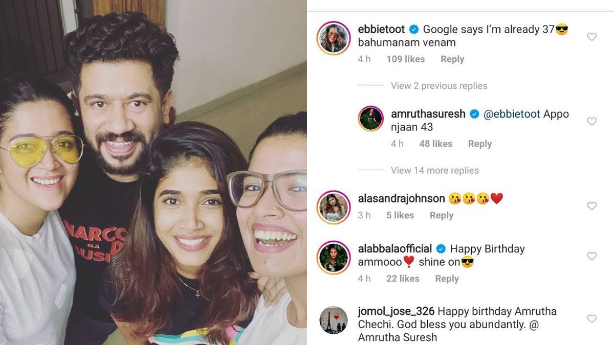 പോസ്റ്റിന് കീഴിലായി കമന്റുമായി അഭിരാമി സുരേഷും എത്തിയിരുന്നു. എനിക്ക് 37 ആയെന്നാണ് ഗൂഗിള് പറയുന്നത്. ബഹുമാനം വേണമെന്നായിരുന്നു അഭിരാമിയുടെ കമന്റ്. നിനക്ക് 37 ആണെങ്കില് എനിക്ക് 43 ആണല്ലോയെന്നായിരുന്നു അമൃത മറുപടി നല്കിയത്. അഭിരാമിയുടെ അടുത്ത സുഹൃത്തും ബിഗ് ബോസിലെ സഹമത്സരാര്ത്ഥിയുമായ സാന്ഡ്രയും അഭിരാമിക്ക് ആശംസ അറിയിച്ച് എത്തിയിരുന്നു. സഹോദരിമാരുടെ കമന്റ് ഇതിനകം തന്നെ വൈറലായി മാറിക്കഴിഞ്ഞിട്ടുണ്ട്.