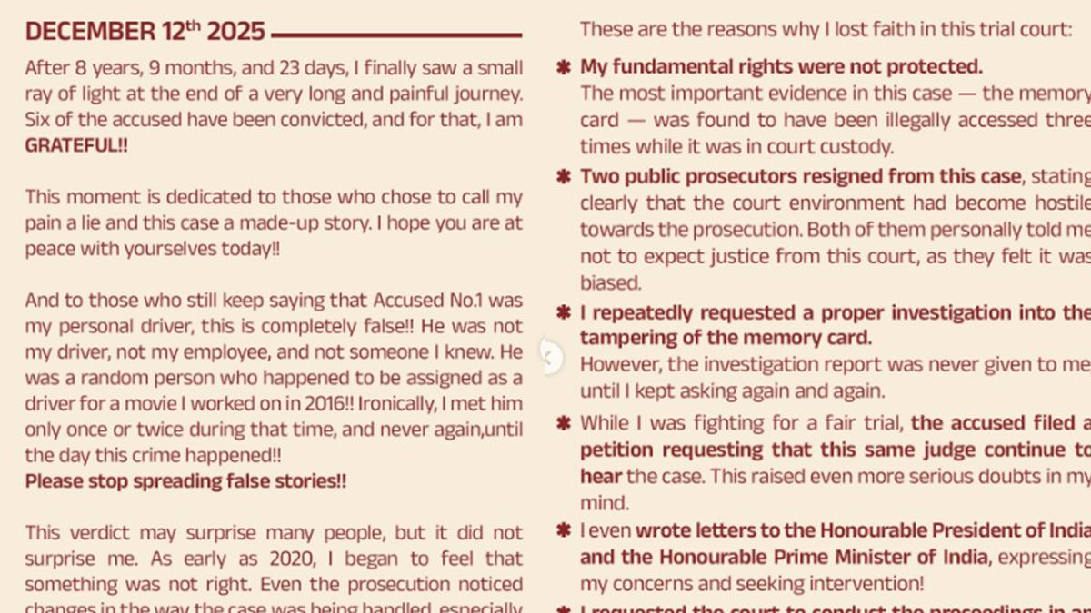 വിധിയിൽ അത്ഭുതമില്ല, ജഡ്ജ് ചെയ്തത് എന്റെ സംശയങ്ങൾക്ക് ബലം നൽകി; പ്രതികരിച്ച് അതിജീവിത