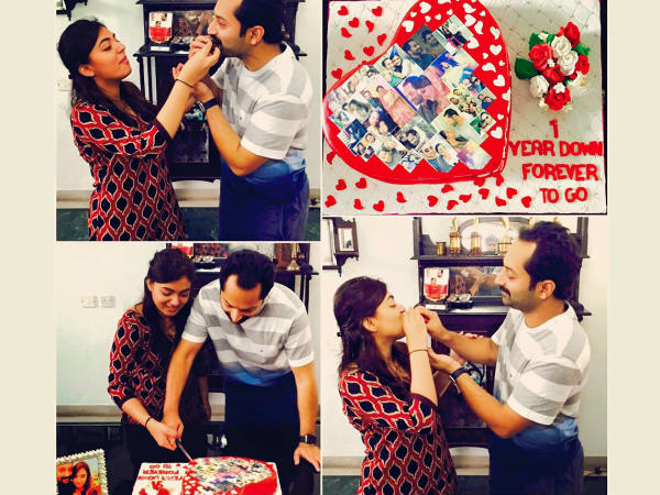 ഒന്നാം വിവാഹ വാര്ഷികം ആഘോഷിക്കുന്ന ഫഹദ്- നസ്രിയ. സ്നേഹത്തോടെ ഫഹദിന് നസ്രിയ കേക്ക് നല്കുന്നു.