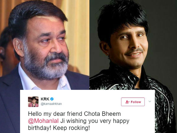 പിറന്നാള് ദിനത്തില് വീണ്ടും മോഹന്ലാലിനെ കളിയാക്കി കമാല് ആര് ഖാന് എന്ന കെ ആര് കെ. ട്വിറ്ററിലൂടെ വീണ്ടും ലാലിനെ ചോട്ടാ ഭീം എന്ന് വിളിച്ചുകൊണ്ട് എത്തിയിരിയ്ക്കുകയാമ് കെ ആര് കെ.