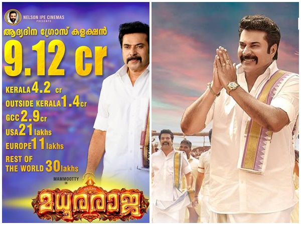 ഇപ്പോഴിതാ മധുരരാജയുടെ ആദ്യദിന കളക്ഷന് നിര്മാതാവ് നെല്സണ് ഐപ്പും അണിയറ പ്രവര്ത്തകരും ചേര്ന്ന് പുറത്ത് വിട്ടിരിക്കുകയാണ്. ഫേസ്ബുക്കിലൂടെയാണ് മധുരരാജയുടെ കളക്ഷന് പുറത്ത് വന്നത്. റിലീസ് ദിവസം 9.12 കോടിയാണ് മധുരരാജയുടെ ഗ്രോസ് കളക്ഷന്. കേരള ബോക്സോഫീസില് നിന്നും 24.2 കോടിയായിരുന്നു ലഭിച്ചത്. കേരളത്തിന് പുറത്ത് 1.4 കോടിയും ജിസിസി യില് 2.9 കോടിയും ലഭിച്ചു.