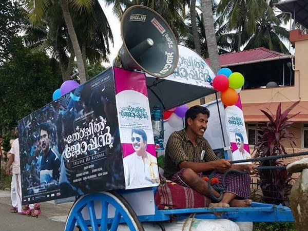 വിവിധ ജില്ലകളിലെ ആരാധക സംഘങ്ങളാണ് തോപ്പില് ജോപ്പനെ വ്യത്യസ്തമായ രീതിയില് പ്രചരണം നടത്തുന്നത്. കാളവണ്ടിയിലാണ് പ്രചരണം. പ്രചരണം നടത്തുന്നതിന്റെ ചിത്രങ്ങളും സോഷ്യല് മീഡിയയില് വൈറലാകുന്നു. ചിത്രങ്ങള് കാണാം..