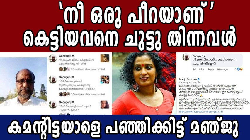 കൊറോണയുടെ ഇടയ്ക്ക് നിന്റെ പേഴ്സണല് കാര്യങ്ങള് കാണാനല്ല ഇവിടെ നേരം എന്ന അഭിപ്രായമുള്ളവര്ക്ക് ദയവായി ഈ പോസ്റ്റ് സ്കിപ് ചെയ്തു പോകാം. എന്നു പറഞ്ഞാണ് മഞ്ജു പോസ്റ്റ് ആരംഭിക്കുന്നത്. നീ ഒരു പീറയാടി, കെട്ടിയവനെ ചുട്ടു തിന്നില്ലേ നീ എന്നായിരുന്നു ഇയാളുടെ കമന്റ്.