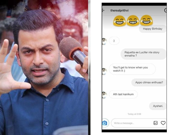 ലൂസിഫറിന്റെ ക്ലൈമാക്സിനെക്കുറിച്ച് ചോദിച്ച ആരാധകന് പൃഥ്വിരാജ് നല്കിയ ഗംഭീര മറുപടി! കാണൂ!