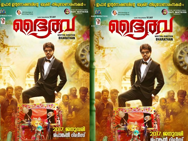 വിജയ് യുടെ അറുപതാം ചിത്രമായ ഭൈരവയുടെ പുറത്തിറങ്ങിയ മലയാളം പോസ്റ്റര്.