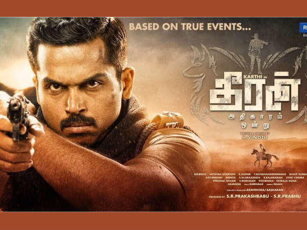 സിരുത്തൈ എന്ന ചിത്രത്തിന് ശേഷം കാര്ത്തി വീണ്ടും പോലീസ് വേഷത്തിലെത്തുന്ന ചിത്രമാണ് ധീരന് അധികാരം ഒണ്ട്ര്. ചതുരംഗ വേട്ടൈ എന്ന ചിത്രത്തിലൂടെ ശ്രദ്ധേയനായ എച്ച് വിനോദ് രചനയും സംവിധാനവും നിര്വഹിക്കുന്ന ചിത്രത്തിന്റെ ട്രെയിലര് പുറത്തിറങ്ങി. 24 മണിക്കൂറിനുള്ളില് ഒരു മില്യനോളം കാഴ്ചക്കാരെ നേടിയ ട്രെയിലര് യൂടൂബ് ട്രെന്ഡിംഗില് നാലാം സ്ഥാനത്തെത്തി. കോളിളക്കം സൃഷ്ടിച്ച ഒരു യഥാര്ത്ഥ സംഭവത്തിന്റെ ചലച്ചിത്രാവിഷ്കാരമാണ് ധീരന് അധികാരം ഒണ്ട്ര്.