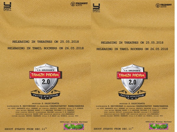 പോസ്റ്ററില് ഒന്ന് സിനിമയുടെ തിയറ്റര് റിലീസ് തീയതിയും മറ്റൊന്ന് പൈറസി സൈറ്റായ തമിഴ് റോക്കേര്സുമാണ്. റിലീസ് ചെയ്തതിന്റെ അടുത്ത ദിവസം തന്നെ വ്യാജനെ പുറത്തിറക്കുന്ന സൈറ്റാണ് തമിഴ് റോക്കേര്സ്. അതു കൊണ്ടാവാം അവര്ക്കും കൂടി റിലീസ് തീയതി കൊടുത്ത് സിനിമയുടെ അണിയറ പ്രവര്ത്തകര് ഞെട്ടിച്ചിരിക്കുന്നത്.
