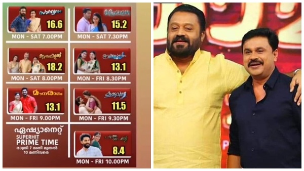 രസകരമായ മറ്റൊരു കാര്യം സുരേഷ് ഗോപിയും ദിലീപും ഒരുമിച്ചെത്തിയ ഓണപരിപാടിയും കുടുംബവിളക്കിനെ മറികടന്നില്ല എന്നതാണ്. കോമഡി മാമാങ്കം എന്ന പേരില് മറ്റ് മിമിക്രി താരങ്ങളെ കൂടി പങ്കെടുപ്പിച്ച് കൊണ്ടായിരുന്നു ഏഷ്യാനെറ്റ് പ്രത്യേക ഷോ ഏര്പ്പെടുത്തിയത്. ഏറെ കാലത്തിന് ശേഷം ദിലീപ് ടെലിവിഷന് പരിപാടിയില് എത്തിയതാണെന്നുള്ള പ്രത്യേകത കൂടി ഉണ്ടായിരുന്നു. സുരേഷ് ഗോപിയ്ക്കൊപ്പമുള്ള കൗണ്ടര് ഡയലോഗും തമാശകളുമൊക്കെ വൈറലായെങ്കിലും പ്രതീക്ഷിച്ചത് പോലൊരു കുതിപ്പ് നടന്നില്ലെന്നാണ് റിപ്പോര്ട്ടുകള് സൂചിപ്പിക്കുന്നത്.
