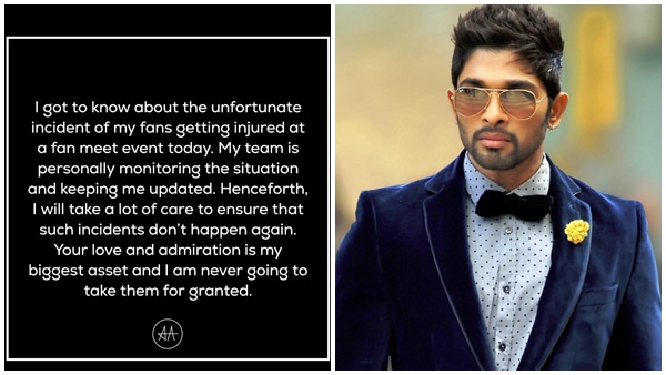 നടന്റെ വാക്കുകൾ ഇങ്ങനെ...'' "ഇന്നത്തെ ഒരു ഫാന്സ് മീറ്റ് പരിപാടിയില് വെച്ച് എന്റെ ആരാധകര്ക്ക് പരിക്ക് പറ്റിയ നിര്ഭാഗ്യകരമായ സംഭവത്തെ കുറിച്ച് ഞാന് അറിഞ്ഞു. എന്റെ ടീം വ്യക്തിപരമായി സാഹചര്യം നിരീക്ഷിക്കുകയും എന്നെ അറിയിക്കുകയും ചെയ്യുന്നു."ഇനി മുതല് ഇത്തരം സംഭവങ്ങള് ആവര്ത്തിക്കാതിരിക്കാന് ഞാന് വളരെയധികം ശ്രദ്ധിക്കും. നിങ്ങളുടെ സ്നേഹവും ആരാധനയുമാണ് എന്റെ ഏറ്റവും വലിയ സമ്പത്ത്, ഞാന് ഒരിക്കലും അവയെ നിസ്സാരമായി കാണില്ല" എന്ന് അല്ലു അർജുൻ കുറിച്ചു.