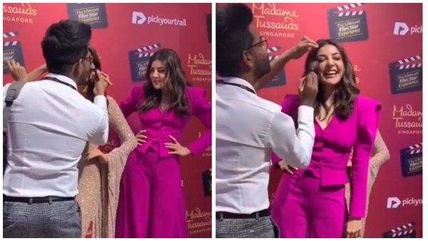 മെഴുകു പ്രതിമയെ മേക്കപ്പിടുന്ന മേക്കപ്പ് മാനെ തള്ളി മാറ്റി പകരം കാജല് മുന്നില് കയറി നില്ക്കുന്നതാണ് കാണിക്കുന്നത്.