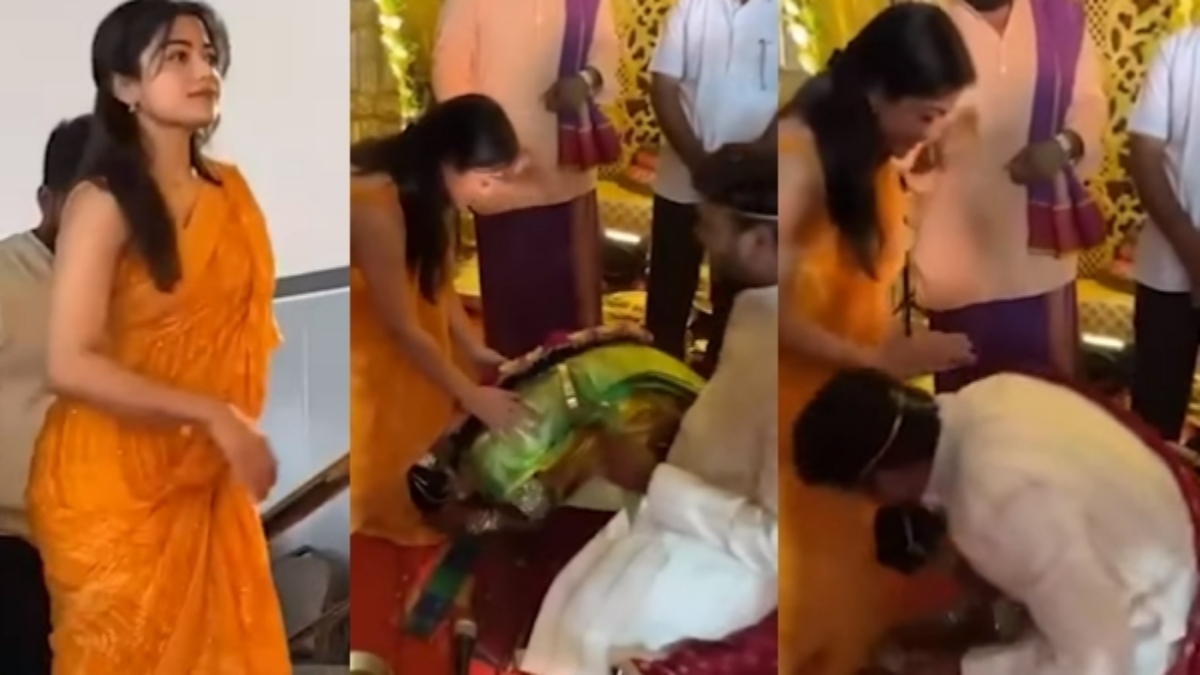 രശ്മിക മന്ദാനയുടെ കാലിൽ വീണ് അനുഗ്രഹം വാങ്ങി നവദമ്പതികൾ... ആശിർവദിച്ച് നടിയും, പരിഹസിച്ച് സോഷ്യൽമീഡിയ!