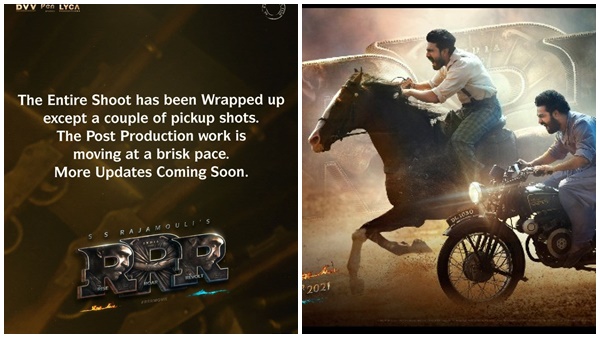 ബാഹുബലിക്ക് ശേഷം എസ്.എസ്. രാജമൗലി സംവിധാനം ചെയ്യുന്ന ബ്രഹ്മാണ്ഡ ചിത്രമാണ് ആർ ആർ ആർ. സിനിമയുടെ ചിത്രീകരണം പൂർത്തിയായിട്ടുണ്ട്. . ഇനി ഏതാനും പിക്ക്അപ്പ് ഷൂട്ടുകൾ മാത്രമാണ് ബാക്കിയുള്ളത്. കൂടാതെ സിനിമയുടെ പോസ്റ്റ് പ്രൊഡക്ഷൻ ജോലികൾ ദ്രുതഗതിയിൽ ആരംഭിച്ചുകഴിഞ്ഞു. സിനിമ ഉടൻ തന്നെ പ്രേക്ഷകരിലേക്കെത്തും എന്നാണ് പ്രതീക്ഷ.
