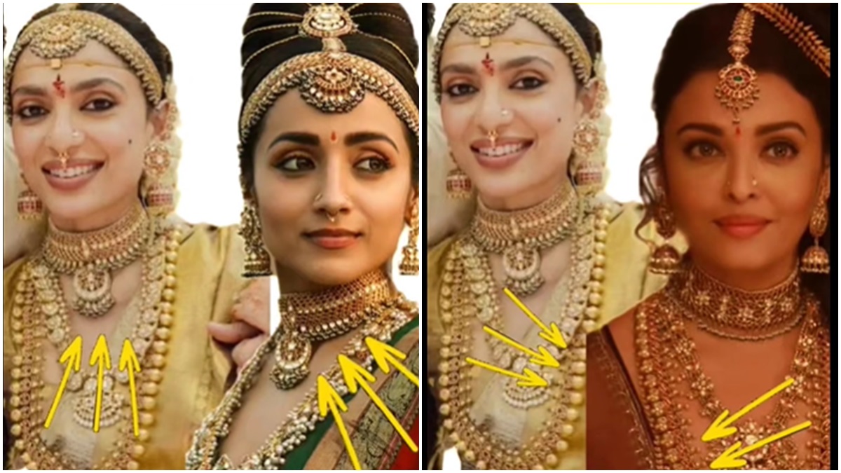 ശോഭിത അണിഞ്ഞ 3 മാലകളില് ഒന്ന് കുന്തന് ജോക്കര് നെക്ലേസ് ആയിരുന്നു. സമാനമായ രീതിയിലുള്ള ചോക്കര് പൊന്നിയന് സെല്വനില് തൃഷ ധരിച്ചതായി കാണാം. ഇതിന് പുറമേ കുറച്ചുകൂടി വലിയ രീതിയിലുള്ള മാല ഐശ്വര്യ റായി ഈ സിനിമയില് ധരിച്ചത് ആയിരുന്നു. ഇത്തരത്തില് സ്വന്തം വിവാഹത്തിന് ആഭരണം കോപ്പിയടിക്കാന് നാണമില്ലേ എന്ന് ചോദിച്ചാണ് വിമര്ശകര് എത്തിയിരിക്കുന്നത്.